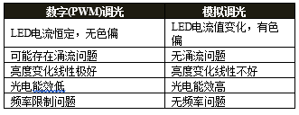 在數字(PWM)調光中,LED電流是頻率固定的(通常超過100Hz)通斷電流。LED始終在標稱電流值時點亮。 LED的平均電流是總標稱電流與調光占空比的乘積,可以通過調整占空比來調整亮度。然而,在模擬調光情況下,LED的電流是連續電流,但是,電流值本身會發生變化。 選擇正確的調光技術取決於該應用的性能指標。兩種調光方法各有利弊,表1列出了其中一些主要利弊。