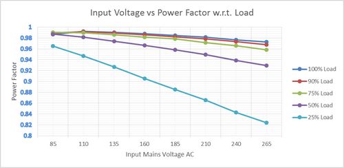 圖5: 在不同負載時輸入電壓 (AC)-功率因數曲線