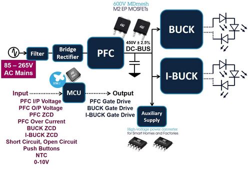 新開發的LED驅動器由STM32F071CB微控制器和三個不同功率級組成,。為實現最佳能效,PFC級和兩個DC-DC轉換器都是臨界導通模式(TM)。第一個降壓DC轉換器和第二個反向降壓轉換器都是恒流模式。反向降壓拓撲結構內的功率開關接地,而不是標準降壓拓撲的連接高邊開關。MCU和包括PM8841D、PM8834和L6395D在內的柵極驅動電路用於管理反激拓撲中的輔助開關電源,VIPer013LS(60 kHz高壓離線轉換器)為MCU和柵極驅動器供電。在100%負載時,LED驅動器系統的總體能效大約91%,這歸功於STD11N60M2-EP N溝道600 V MDmeshTM M2 EP功率MOSFET。