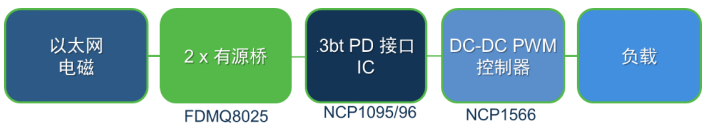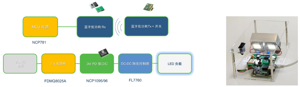 在該免電池方案的無線通信部分採用的是BLE RSL10,特別適合超低功耗的場景,另外,該方案還採用了2個有源橋FDMQ8025A(內置4個MOSFET)、滿足802.3bt標準的受電設備(PD)端介面控制器IC NCP1095/96、支持模擬調光和脈寬調製(PWM)調光的DC-DC 恒流降壓控制器FL7760、輸入電壓達150 V的線性穩壓器NCP781(用於給接收端的BLE晶片供電)。