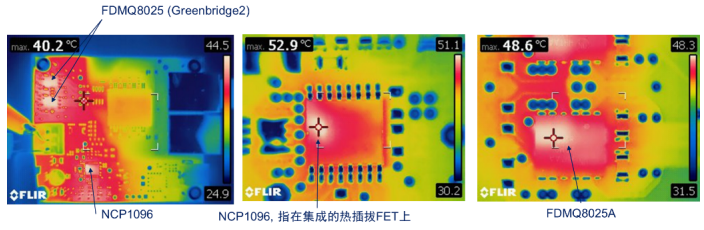 特別地,該方案PoE級的電源轉換能效達99.2%,幾個主要器件的紅外熱像圖,測試條件為PD端第8級71.3 W功率,PD 輸入的最低電壓和最高電流為41.1 VDC和 1.73 A,我們可看到在熱平衡的狀態下,整個板的最高溫度不超過53 ℃,無需額外的散熱處理。