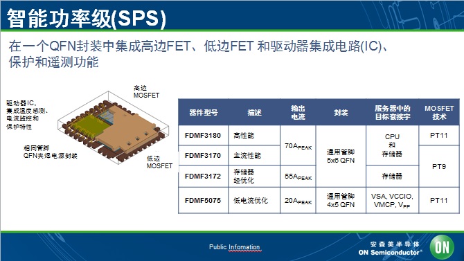 在大型數據中心中,提高CPU和記憶體多相穩壓器的能效能夠節省大量能源開支。例如,將能效從95%提升至95.5%,每年可節省數以百萬計美元的能源開支。安森美半導體的智能功率級器件(SPS)系列,在一個QFN封裝中集成高邊FET、低邊FET 和驅動器 IC、保護和遙測功能,用以優化伺服器系統,實現最佳能效、降低總物料單(BOM)成本,尤其第三代智能功率級器件SPS3為伺服器多相穩壓器提供同類最佳的電源轉換能效。