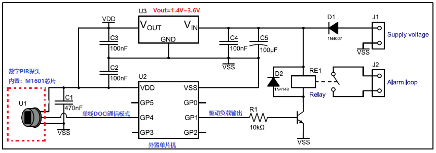 上圖是採用PIR數字探頭的典型應用電路,在熱釋電數字探頭內部集成了全新的PIR信號調理晶片M1601。感測器探頭接收到人體移動移動信號之後,將其轉換成電信號,並通過單線數字介面(相容DOCI模式)將信號以數字模式輸出給外部單片機,單片機對接收到數字信號進一步識別、和處理,並根據預設邏輯控制外部負載的工作狀態。相比之前的數字探頭,採用M1601晶片的探頭功耗大大降低,同時,新增的自檢功能可滿足探頭廠家的半成品自動檢測,節約了後續的檢測工序成本。