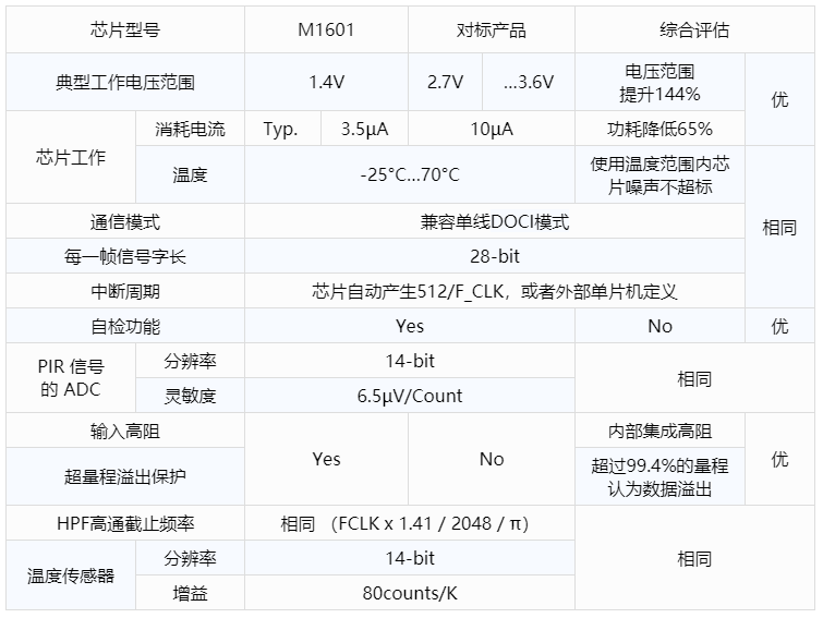 M1601是一款全數字式晶片,集成了傳統模擬探頭的JFET以及絕大部分的周邊電路的功能,專門為數字式熱釋電傳感器量身打造。該晶片設計有兩個PIR輸入引腳,陶瓷敏感元可以採取差模輸入或者共模輸入方式和這兩個引腳直接相連。晶片採集到的PIR信號和感測器的溫度值再通過DOCI單匯流排方式輸出給外部單片機。