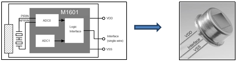 M1601晶片和熱釋電敏感元直接連接 用戶採用M1601晶片得到PIR數字探頭