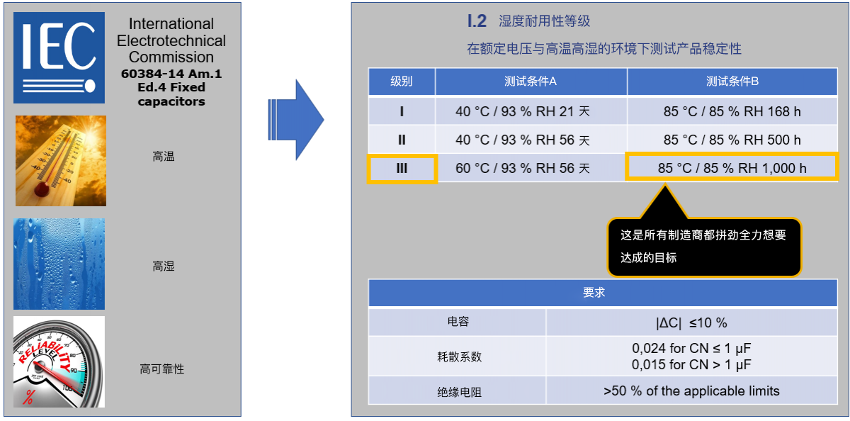 以下是對濕度要求的關鍵性示例,它對於每個嘗試去達到IEC新規範的電容製造商來說都是至關重要的。