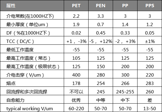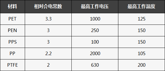 從該表可以看出,PET是擁有最佳電壓、溫度和介電常數組合的材料。
