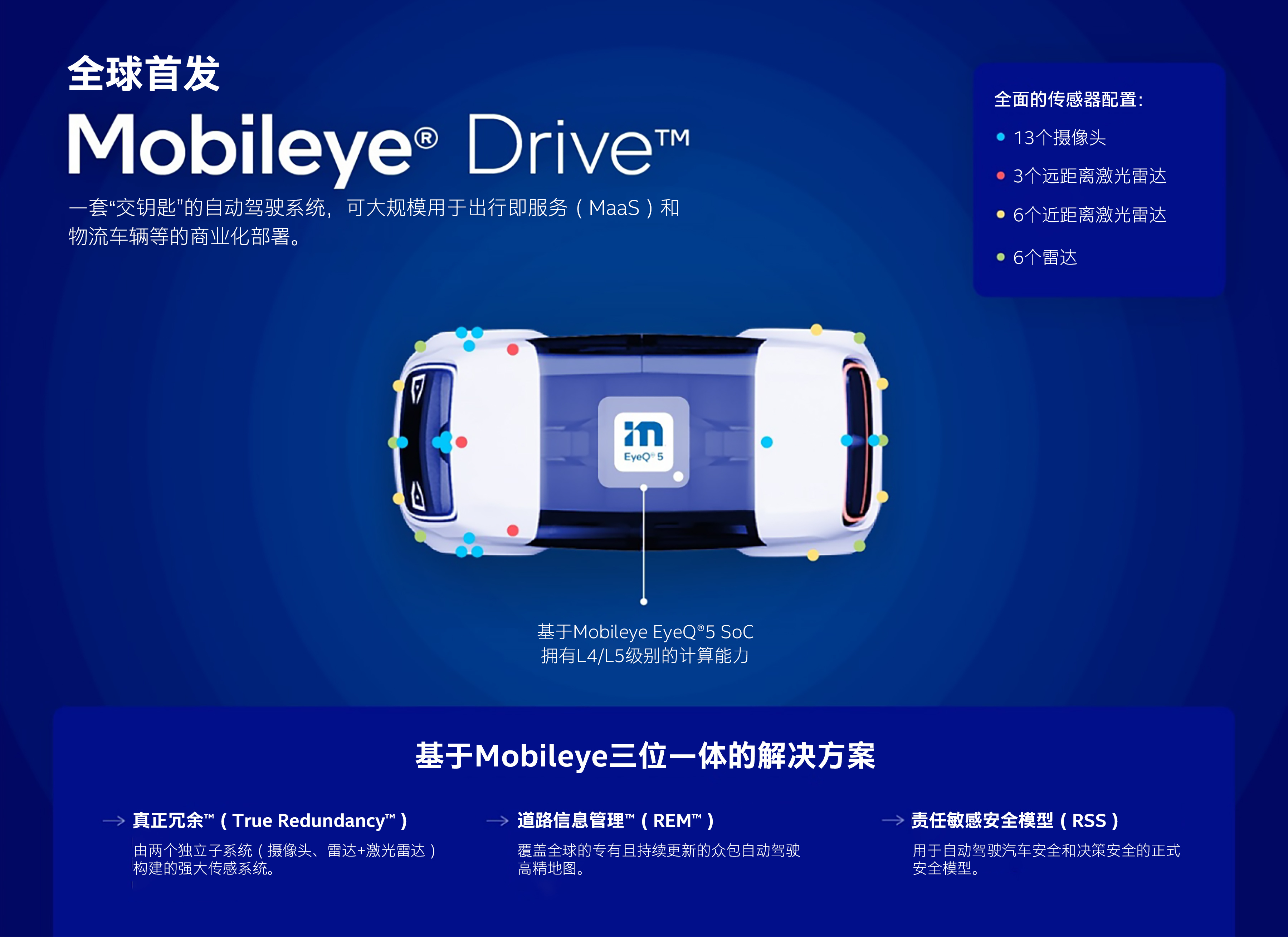 Mobileye Drive專為出行即服務(MaaS)、自動駕駛貨車(ADVs)和消費級自動駕駛汽車而設計,具有強大的安全性、實用性和可擴展性。