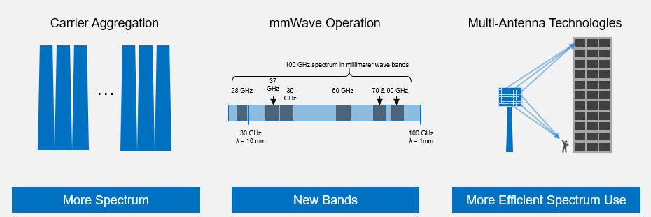 另外,毫米波一直被譽為是提升5G性能的利器,其關鍵優勢之一是可用的大量頻譜帶寬。以往,基於sub 6GHz頻段的4G LTE蜂窩系統可以使用的最大帶寬是100MHz,數據速率不超過1Gbps。而在5G sub-6GHz與毫米波頻段,移動應用可以使用的最大帶寬是400MHz,數據速率高達10Gbps甚至更多。以前毫米波大多都是應用在軍工領域,現在推廣到商用化應用領域,測試設備需要覆蓋毫米波頻段,這對在毫米波段的測試儀表的提出了新的挑戰。