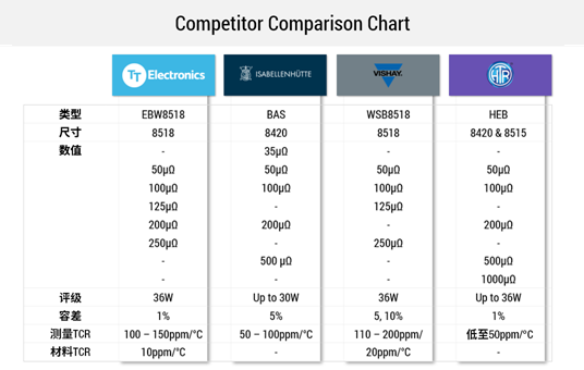 該電阻的低測量誤差可以消除設計人員的誤差預算,其低歐姆值可以降低功耗。EBW8518提供TT Electronics所選範圍50至250µΩ的最全值選擇。