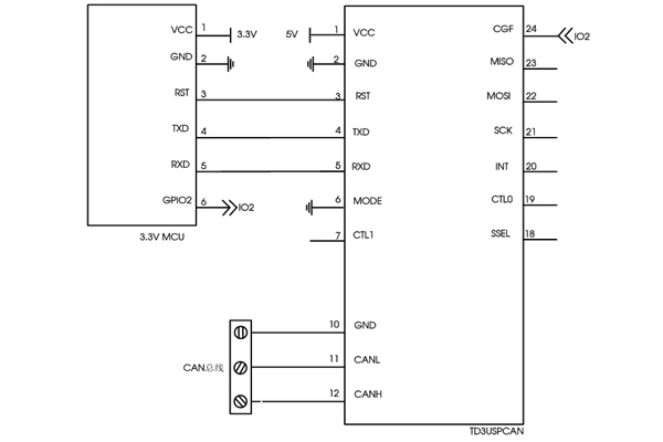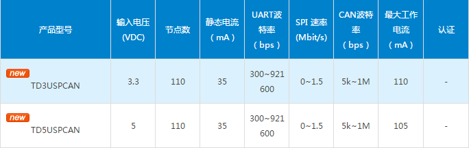TD5(3)USPCAN系列集微處理器、CAN收發器、電源隔離、信號隔離於一體。它可將UART/SPI信號轉換為CAN匯流排差分電平,實現信號介面拓展、隔離;同時產品相容UART/SPI介面,可以直接嵌入到UART/SPI設備中,在設備上拓展更多的CAN通信介面,實現設備和CAN匯流排網路之間數據通信。