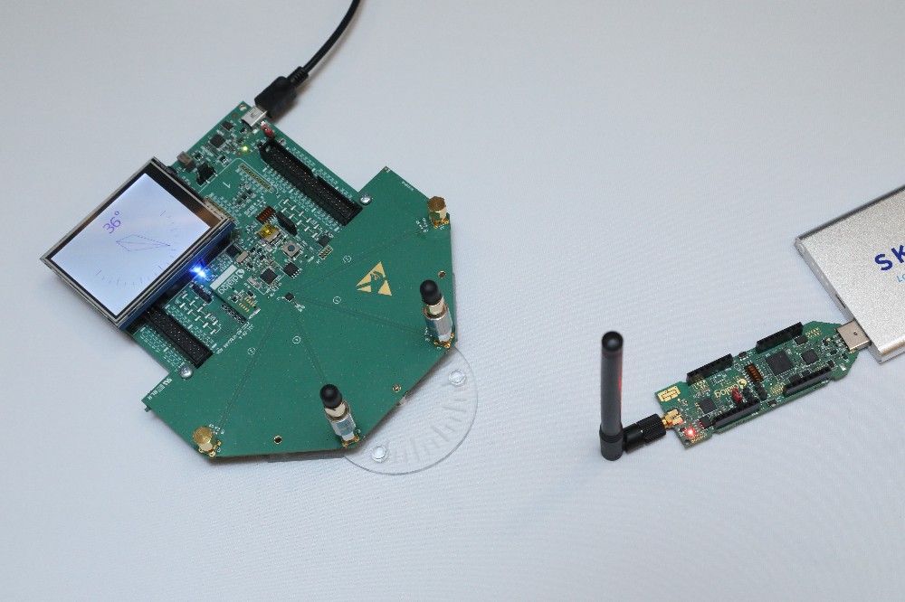 上圖是來自Dialog半導體公司的配置為藍牙接收器的開發板,可FUJI檢測藍牙發射器的到達角度(AoA)。該特定設備設置為十次/秒進行與發射器角度的測量,並在LCD上顯示測量到的角度。