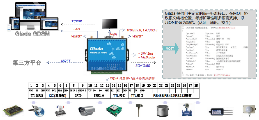 傑和R100在物聯網架構下扮演著智能化網路節點的角色,28pin鳳凰端子相容CypressI2C、TTL、GPIO、USB、RS232/485/422協議,可接入各類感測器,如重力傳感、土壤檢測、風力採集、溫濕度採集、光照傳感、電子圍欄、液壓採集等多種傳感設備,可滿足用戶多樣化的方案需求。