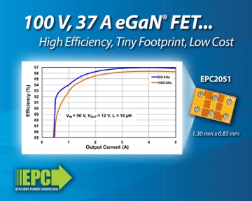 宜普電源轉換公司(EPC)推出100 V、尺寸比等效矽器件小30倍及工作在500 kHz頻率時可實現97%效率的氮化鎵(eGaN®)功率電晶體