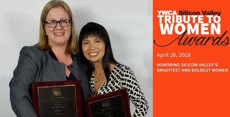 圖1:ADI的兩位女性高管Jen Lloyd與Kay Rhind (右) 一起榮獲 YWCA矽谷“2018 Tribute to Women Award”獎項