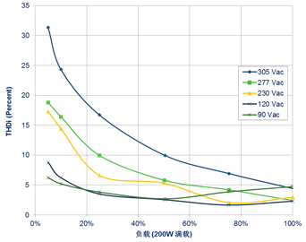 圖3:200 W評估板在不同Vac、負載時的THD性能