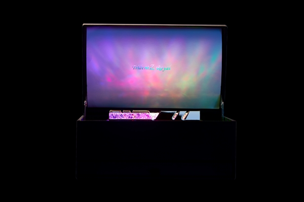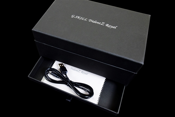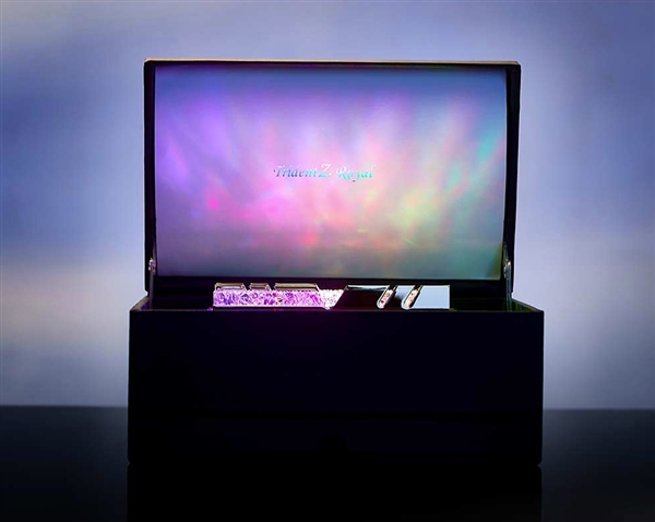 這個小盒子正式名字叫“皇家戟典藏盒”(Trident Z Royal Display Box),人造皮革材質,內部有四條標準的DDR4記憶體插槽,將皇家戟記憶體插上去,通過背部的USB線接入電腦或者充電器,禮盒、記憶體上的發光模組就會閃耀起來。